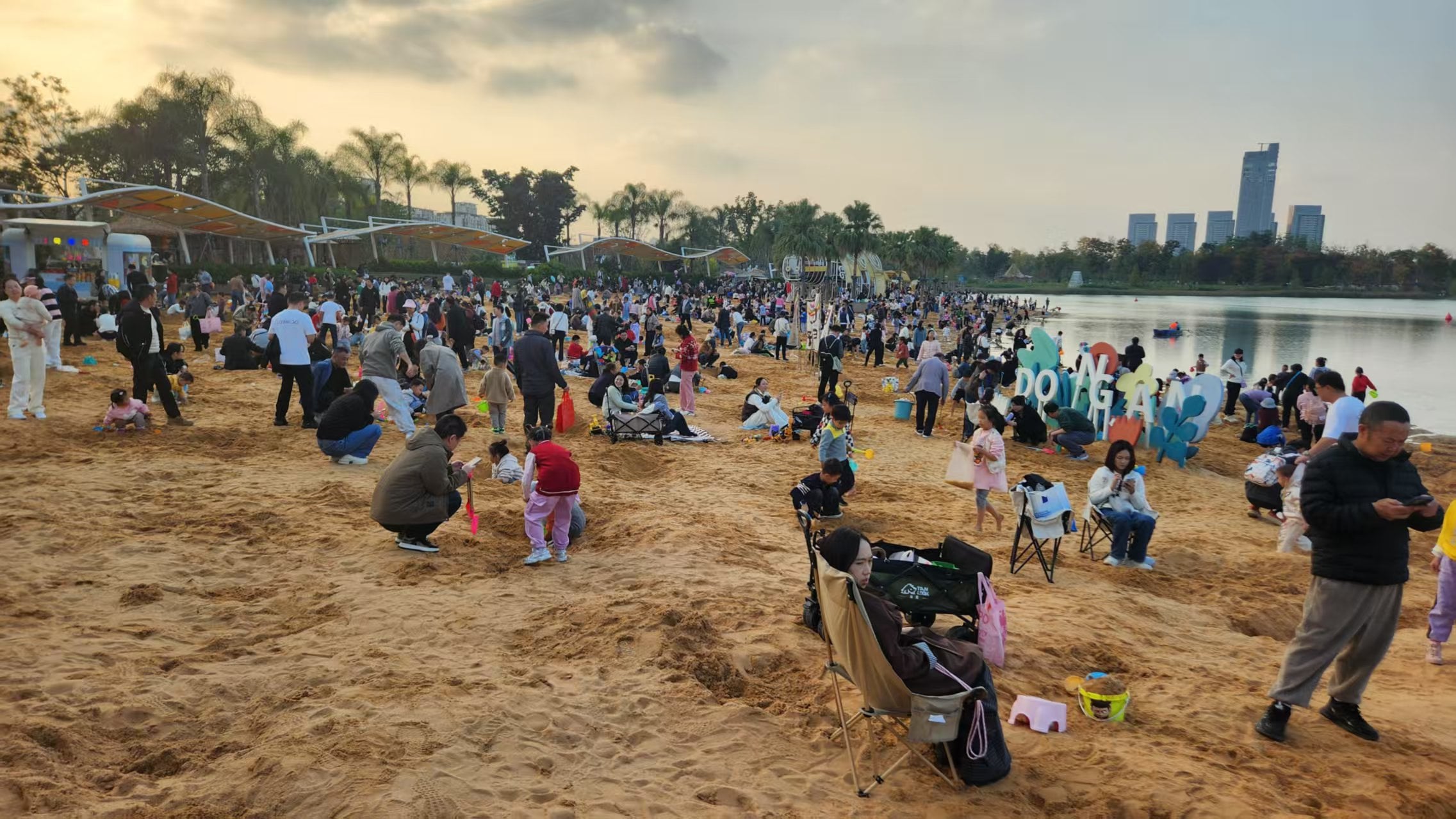 玩了好一会儿,小宝玩够了,就不玩了。于是我们决定前往银沙滩。因为没有租到车,我们就自走,走了30多分钟。期间小宝还爬了树,是真得灵活(老婆说,在农村肯定是爬树的好手),都会爬树了,感叹时间过得真快。(所以要好好记录)。到了银沙滩后,发现密密麻麻都是人。我们找了一个空地陪小宝玩。我们把铲子、桶、模具等拿出来给小宝自己发挥,小宝让我们用铲子挖洞,我们就陪小宝挖洞。后面小宝自己用一个桶装了一点沙子,在沙子上插上树叶,像插花一样,还挺有意思的。在沙滩上玩结束后,我们就准备回家了,看到了蜜雪冰城,点了2杯饮品边走边喝。回程看到路边有自行车,不带一点思考,开自行车,推着小宝和老婆到停车场。